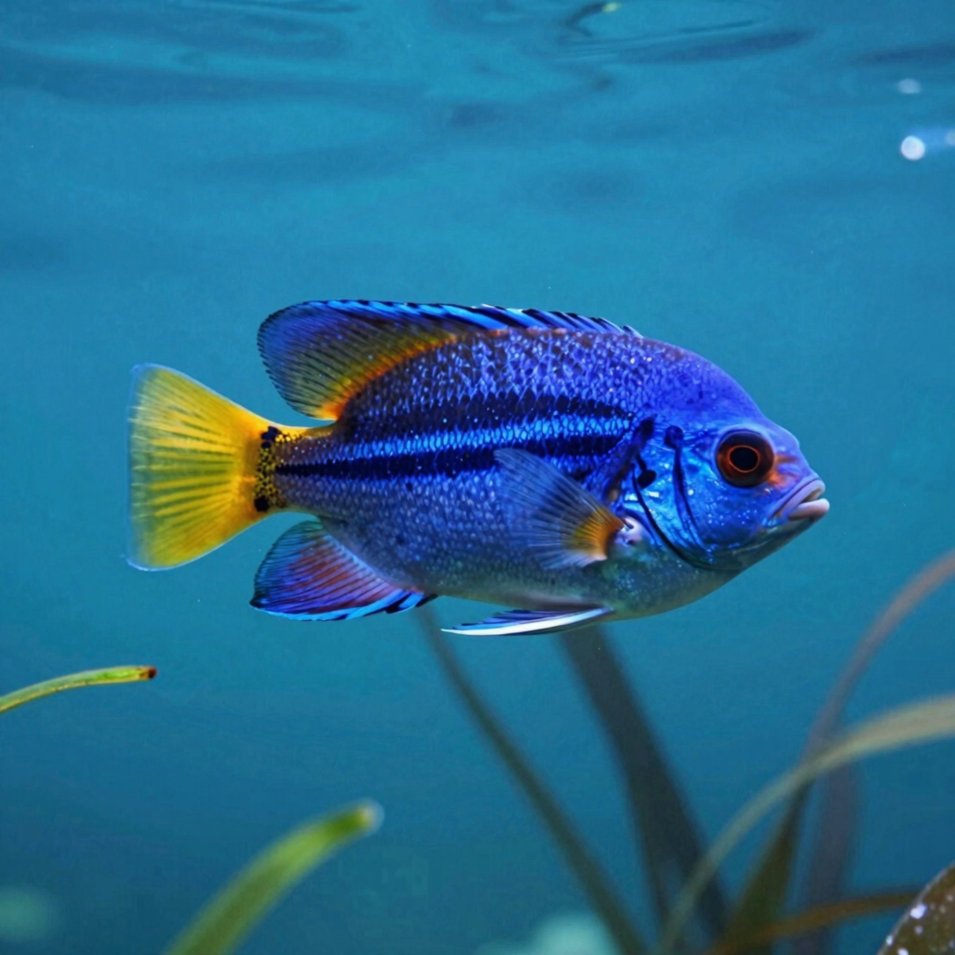 Close-up of a colorful tropical fish swimming through a dense forest of aquatic plants. The lighting is ethereal, highlighting shades of #3A6C66 and #94B5A5 in the plants and scales, capturing a thriving aquatic ecosystem.